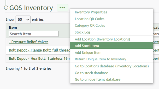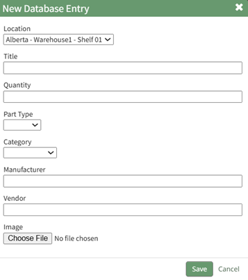 Adding an inventory location creates an additional location option that can be found on the location dropdown menu in the New Database Entry Modal when “Add Stock Item” has been selected from the Inventory Context Menu.