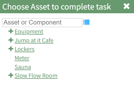 The Choose Asset Modal will prompt you to identify which asset you want to log data for. Click the bulleted list icon to access your assets. Selecting the plus sign “+” icon will expand the components under the asset.