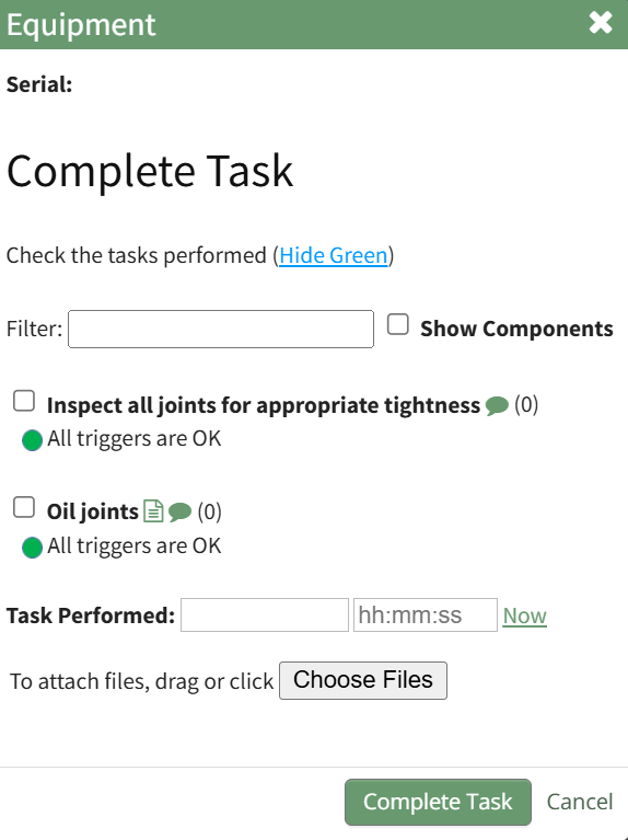 Selecting “Complete Task” from the three dot (…) context menu to the right of the asset / component title will open the same modal for the specified asset.