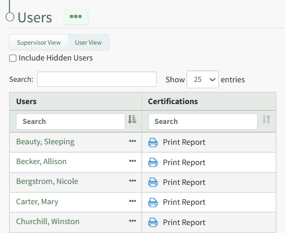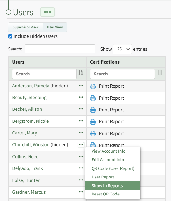 Click the three-dot icon to the right of the user's name who you wish to make visible opening the User Table Context Menu. Select "Show in Reports" from the context menu and the user is no longer hidden.