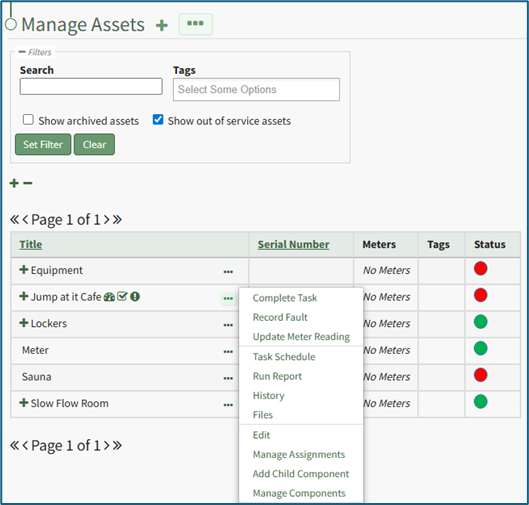 To take an asset out of service and give it a grey task status, open the Manage Assets Page in the Assets Module.