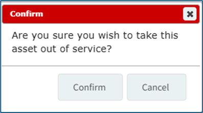 Select the “Take out of service” button opening a confirmation modal stating, “Are you sure you wish to take this asset out of service?”