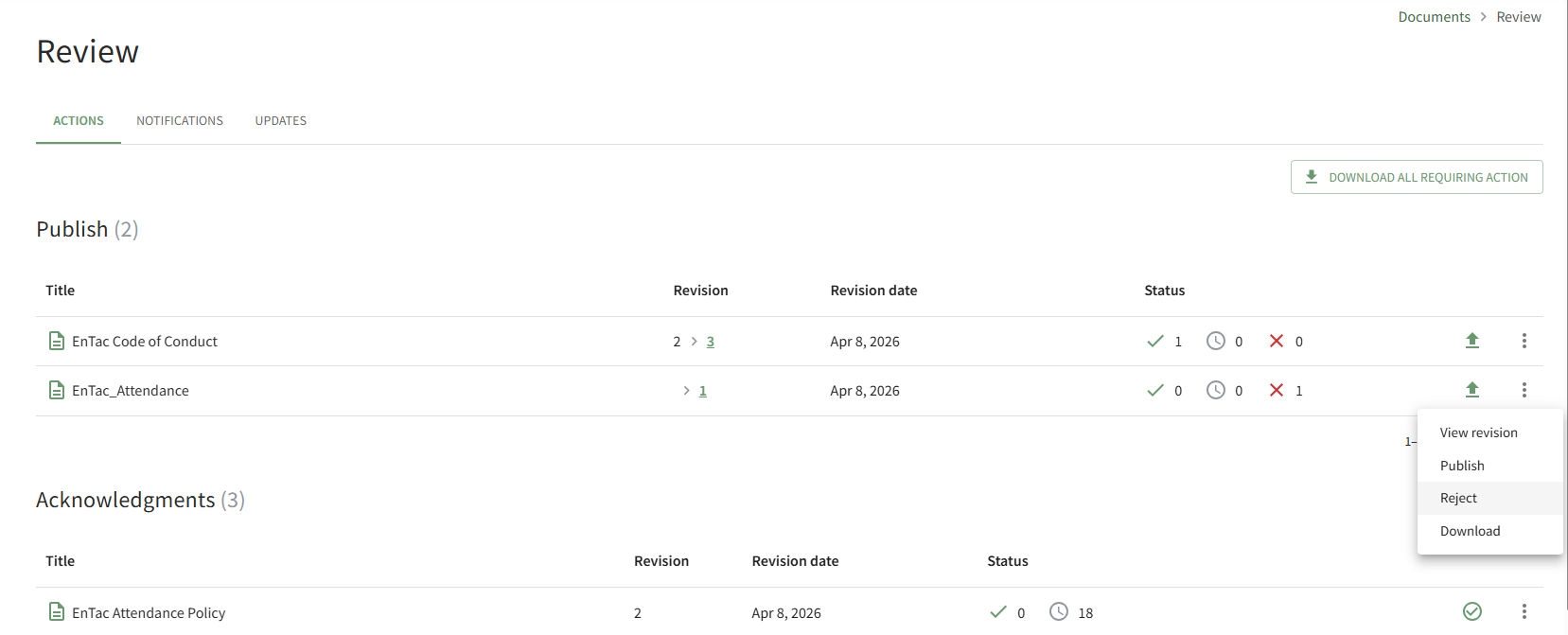 To reject a document/file that has been submitted for publishing and cancel its upload to KAStrack, open the Actions Tab on the Review Page of the Documents Module from the Main Menu. Click the vertical three-dot icon to the right of the file you want to decline, opening the Publish Context Menu.