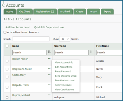 Open the Active Accounts Table on the Active Tab of the Accounts Page and select the three dot (…) icon next to the name of the user whose password you wish to reset.