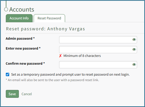 If you select the “Set as a temporary password” checkbox, the user will be required to reset their password on their next login.