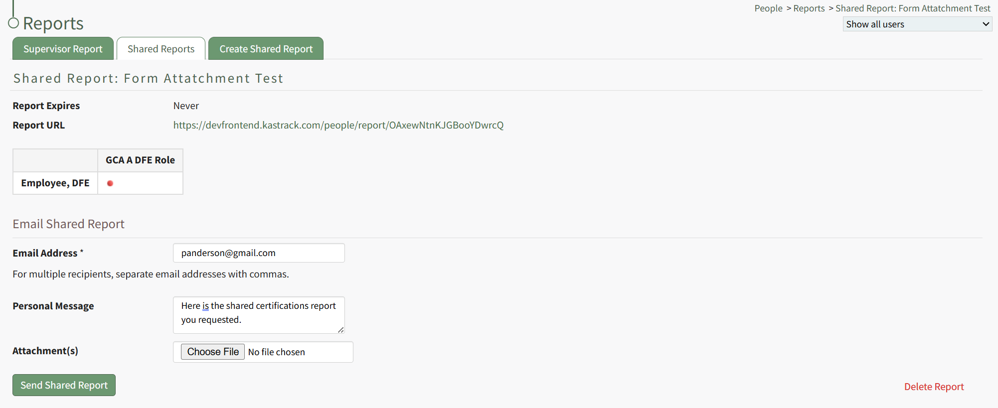 Input the email address(es) of the individuals you would like to share the shared certification reports with, using commas to separate email addresses as needed. Include a personal message and any desired file attachment(s). When done, click the "Send Shared Report" button.