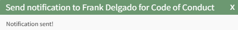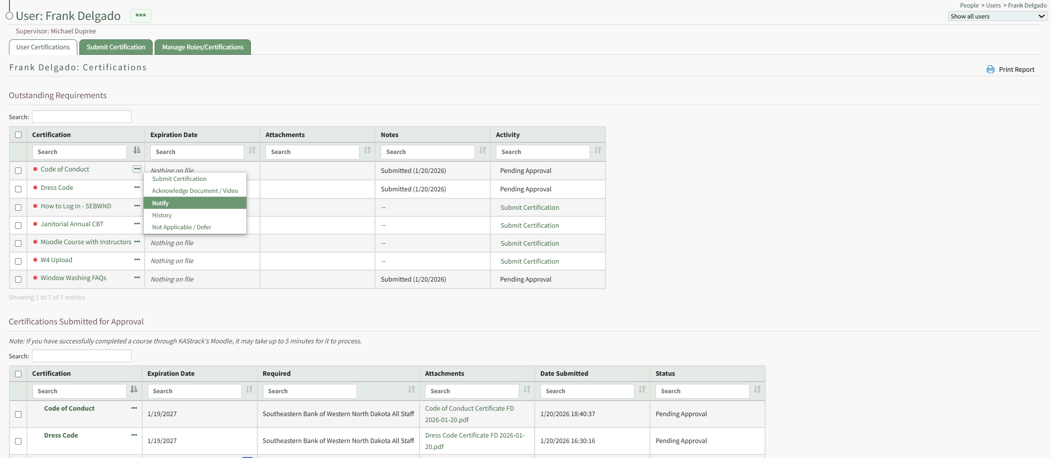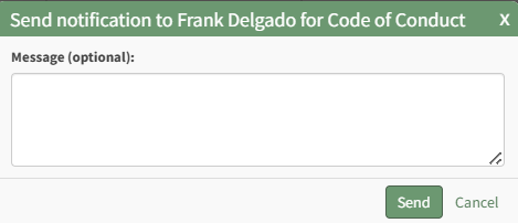 Select the option Notify opening the Send Notification Modal. Use the modal to include an optional message that will be included in the Certification Notification that will be sent to the user through the system via email.
