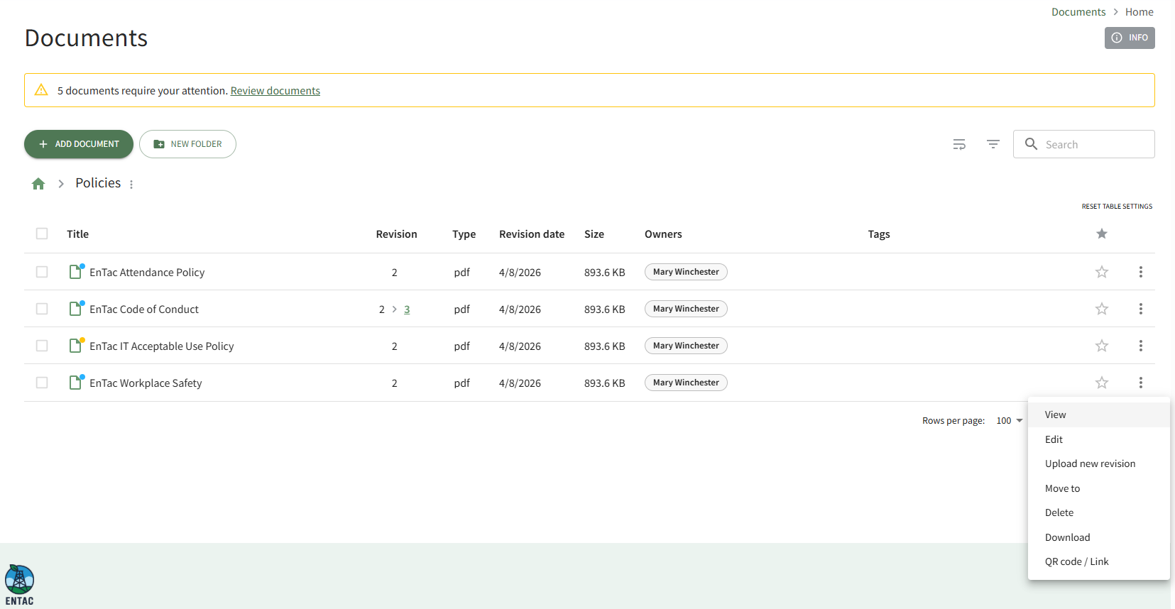 To send an acknowledgement reminder alert for a specific document, open the Home Page in the Documents Module on the Main Menu and navigate the repository to find the document you want to send an acknowledgement reminder for. Click the vertical three-dot icon to the right of the file opening the file's context menu and select View.
