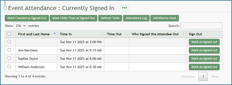 Click the “Mark as Signed Out” button in the row of the entry you wish to be signed out.