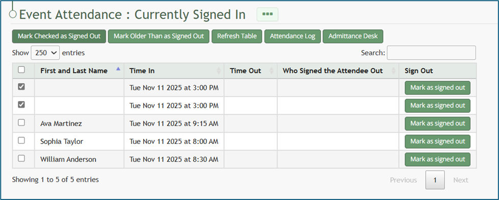 After selecting individuals to be signed out, click the “Marked Checked as Signed Out” button.