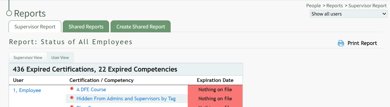 To submit certifications or competencies from the Report: Status table on the Supervisor Report Page of the People Module, confirm you are on the Supervisor Report tab.