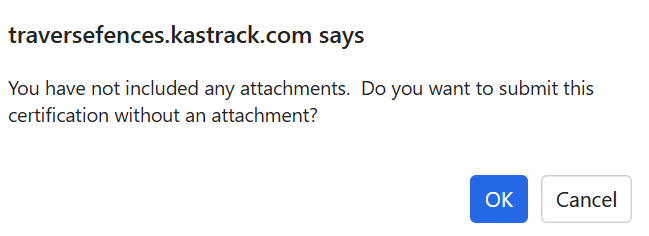 Select the Save Changes button. If no links or files were attached, a Certification Record Confirmation Modal appears stating, "You have not included any attachments. Do you want to submit this certification without an attachment?"