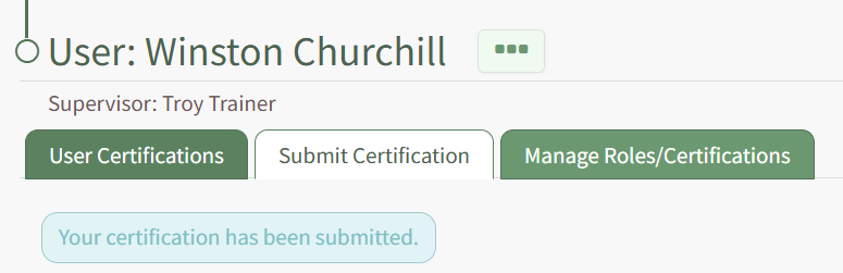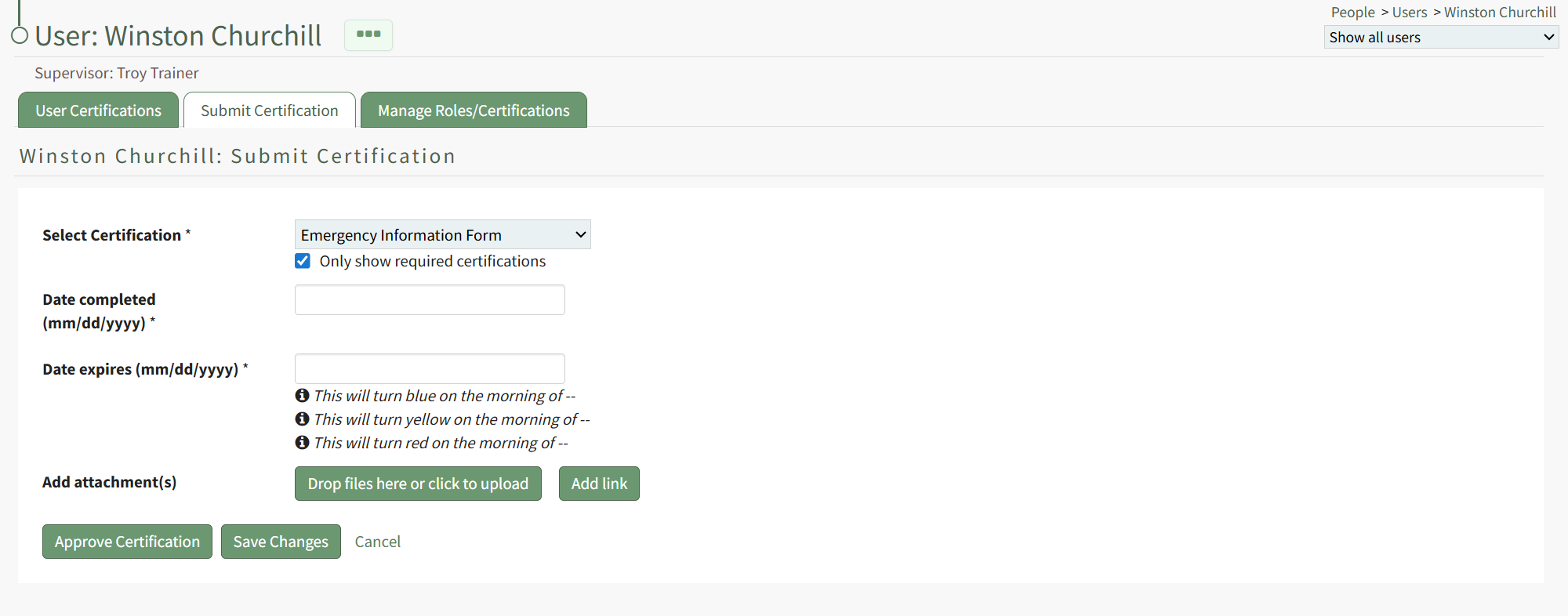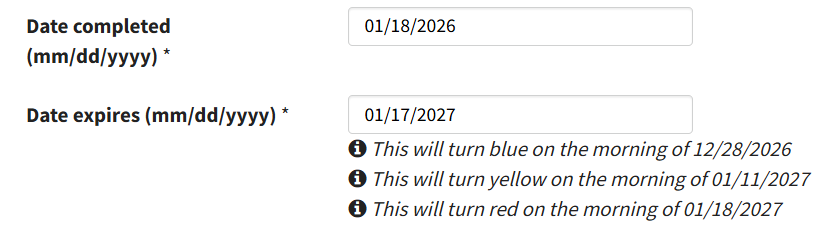 After inputting the completion date, the system fills out the date the certification expires and includes the dates the status will change from green to blue, blue to yellow, and yellow to red. (These details are determined by the specifics associated with the certification.) WIKI LINK TITLE TBD