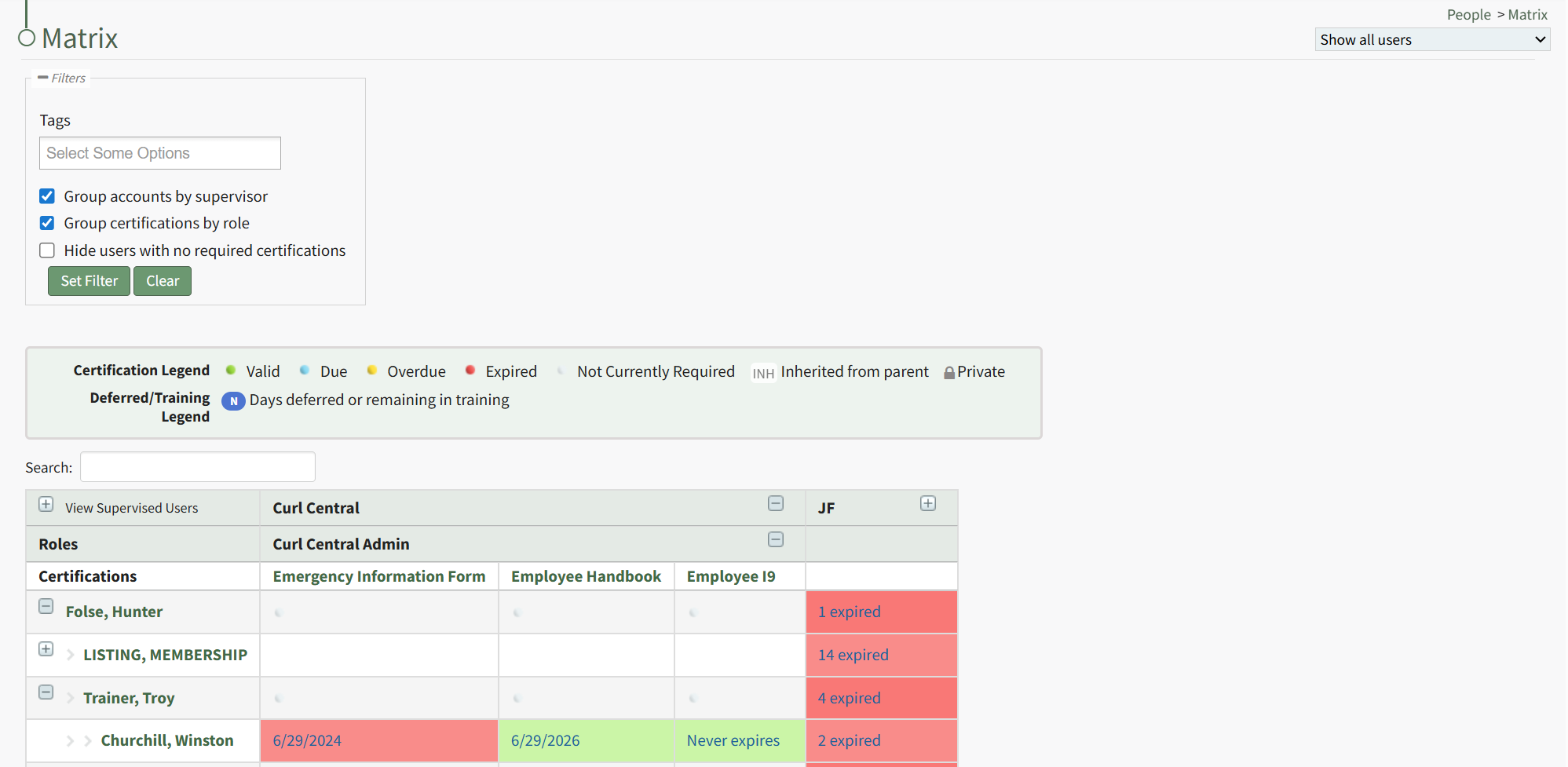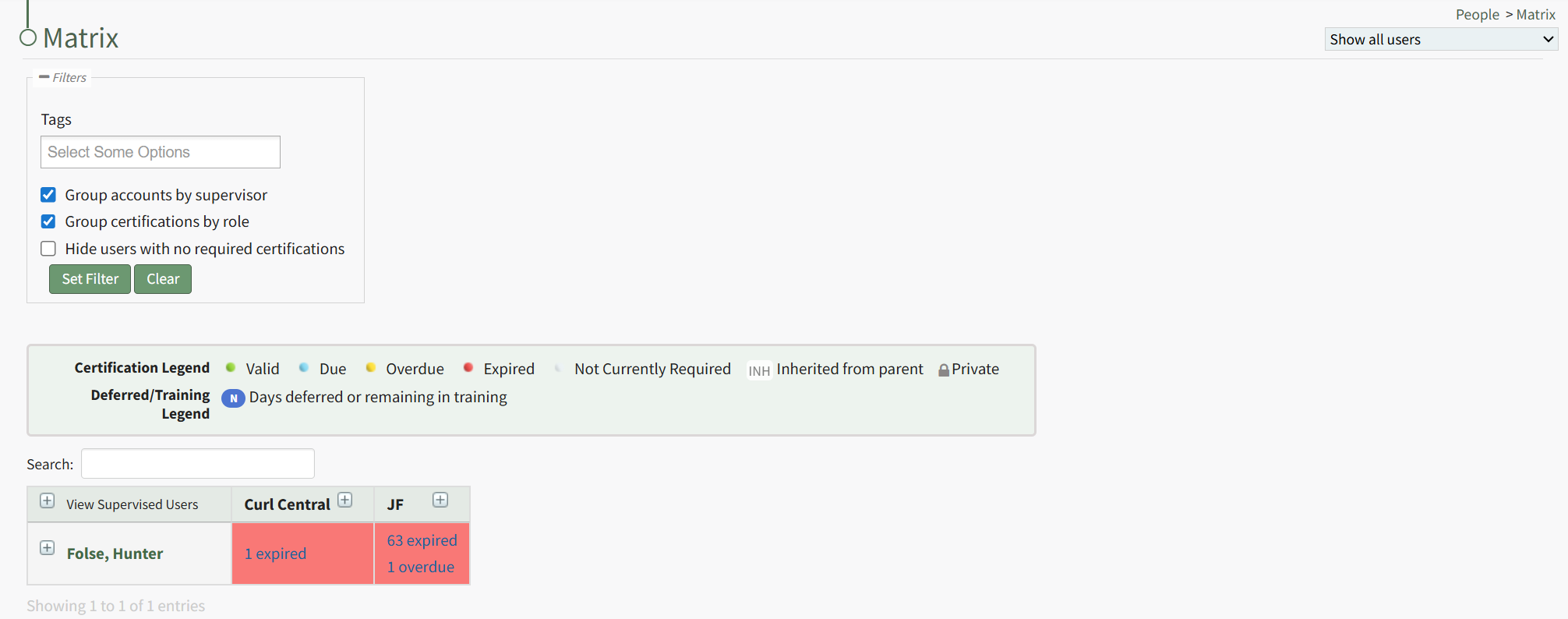 When the Matrix Page is initially opened, it is in a collapsed view. Expand the view as need to identify the relevant user and the specific certifications whose records you wish to update. The date or statement in each cell is a clickable link that when selected opens the specific user's Certification Details Modal.