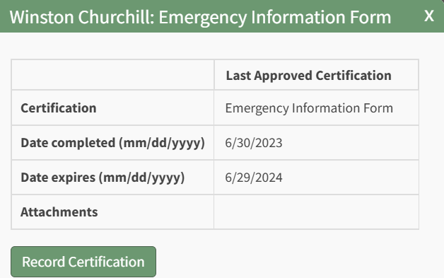 The modal lists the certification name, the date completed, the date the certification expires, and any file attachment. Click the "Record Certification" button to update the assigned certification. This opens the Submit Certifications Tab on the specific individual's User Page.