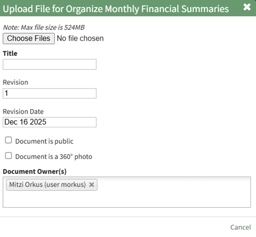 Select the file to be uploaded to the action by clicking the “Choose Files” button and selecting the desired file. Create a Title for the file or click "Use Filename", change the revision number, revision date if needed, and select the checkbox if the document is to be public or if it is a 360-degree photo. Edit document owners if needed.