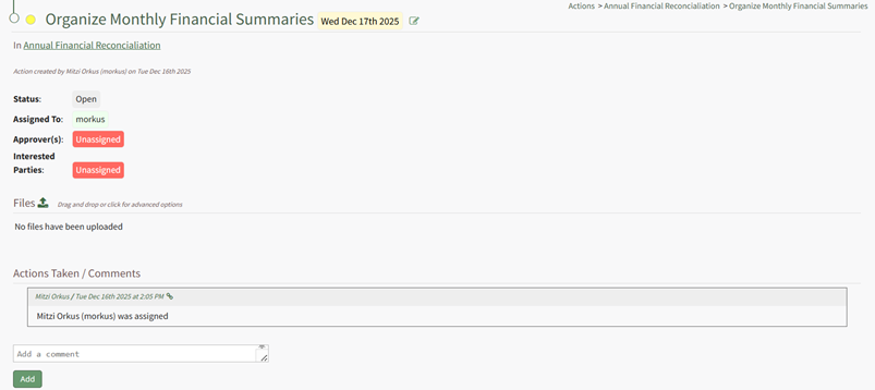 To upload a file to an action, click on an action title opening the individual action’s summary page.