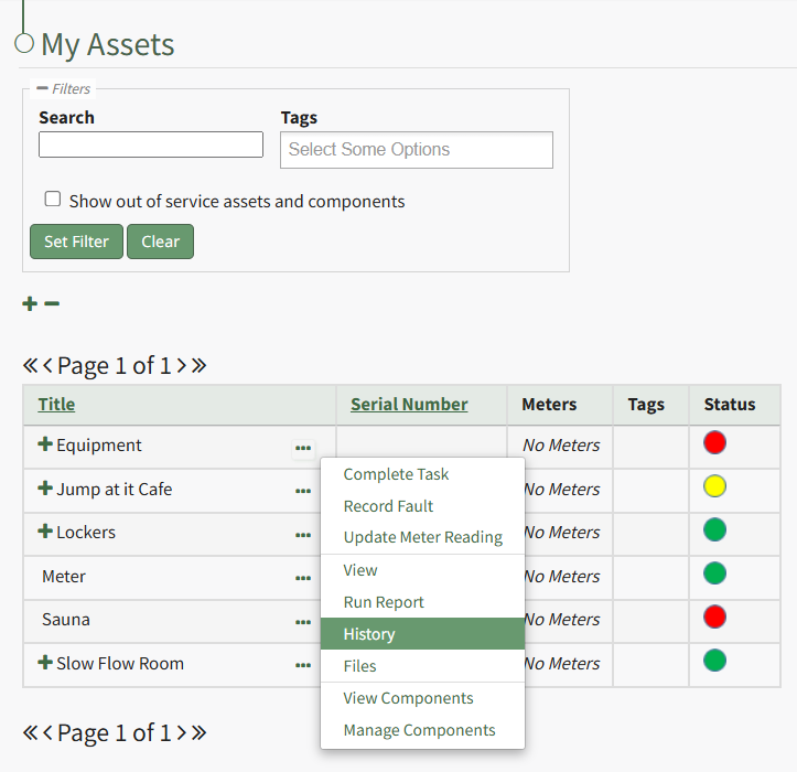 An asset's historical data can be accessed from an asset's History Page. To access an asset's history, go to the My Assets Page in the Assets Module on the Main Menu. Use the filters as needed to identify the access whose history you wish to view, and click the three-dot icon to the right of the asset name. This opens a context menu.