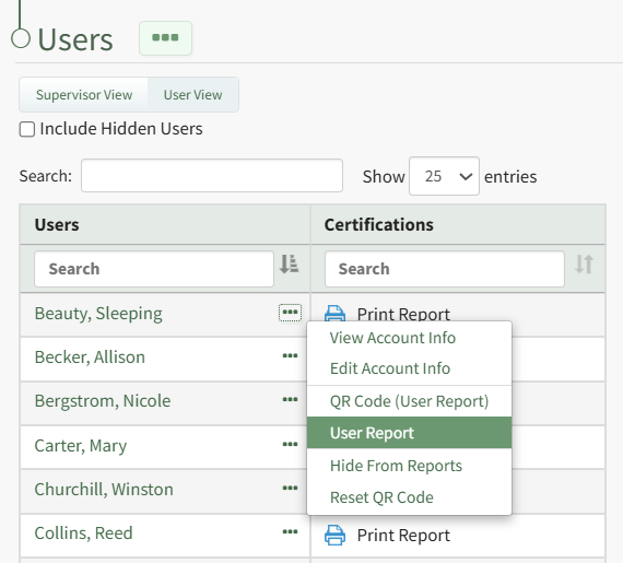 To view a User's Roles and Certifications Report, open the Users Page in the People Module from the Main Menu. Click the three-dot icon to the right of the user whose roles and certifications report you wish to view.