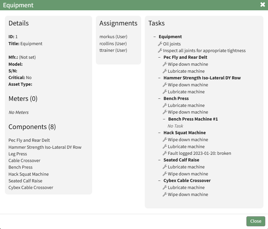 This opens the Asset Summary Modal. The read-only modal shows the asset details, meters associated with the asset, lists the components of the asset, the users assigned to the asset, and any tasks on the asset's task schedule.