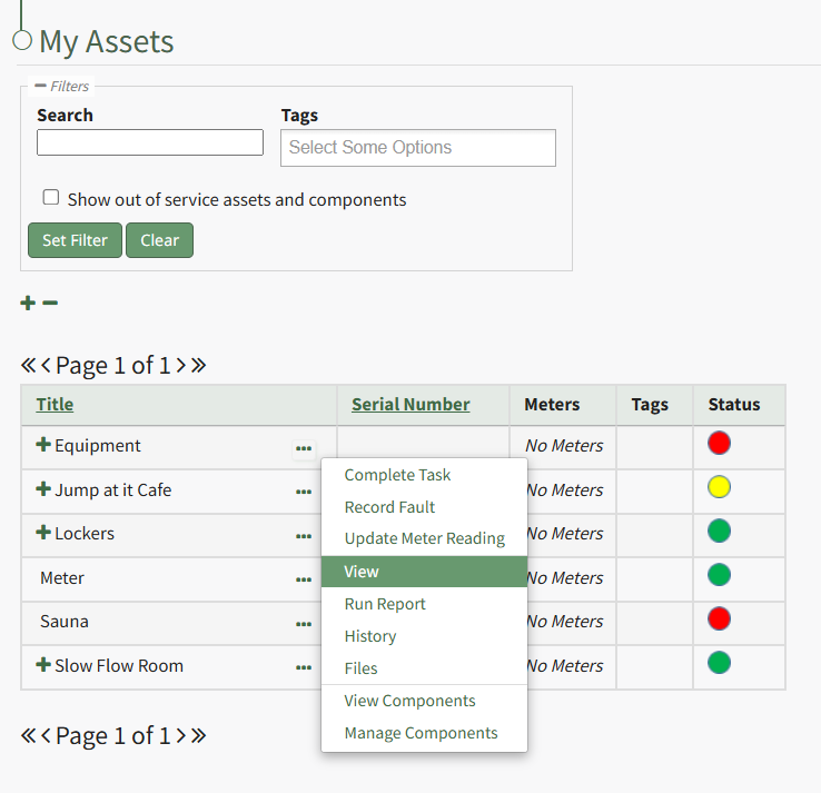 To view an asset's summary modal that lists all relevant information regarding an asset, go to the My Assets Page under the Assets Module on the Main Menu. Use filters as needs to pull up the asset you wish to view. Click the three-dot icon to the right of the asset/component title opening the context menu and select "View".