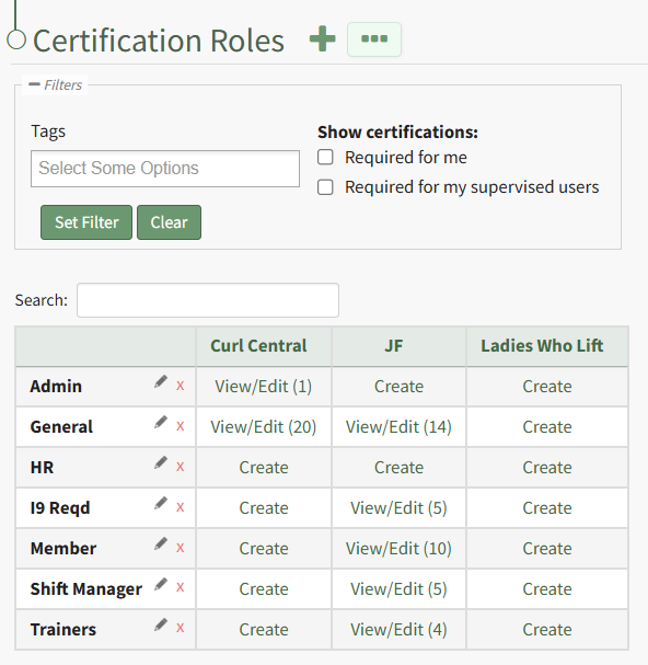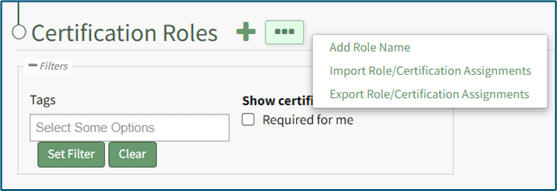 The filter section on the Certification Roles Page allows you to filter roles by tags. Checkboxes allow an individual to show certifications "Required for me" or to show certifications "Required for my supervised users".