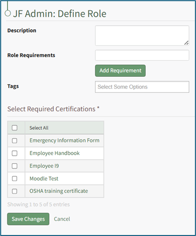 Alter the description, role required, tags, and/or any competency settings for the Certification Role (if competency tracking is enabled for your KAStrack installation), and then click the “Save Changes” button to return to the Role Info Tab. WIKI LINK HOW TO DEFINE COMPETENCY SETTINGS FOR A ROLE