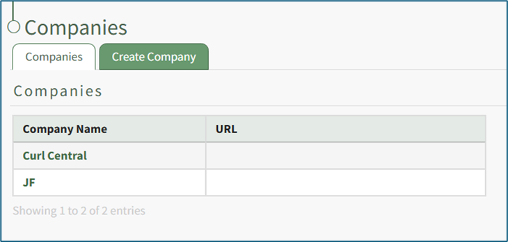 The Companies Table on the Companies Page shows a list of companies that have been created, along with a clickable URL, If applicable. A URL associated with the company will display in the right column. If no URL has been added, the URL cell for that company will be blank.