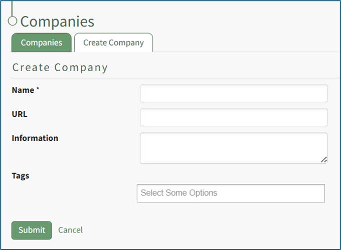 Input the new Company name (required), an associated URL, and any descriptive information you wish to be included on the Company: (Company Name) Page.