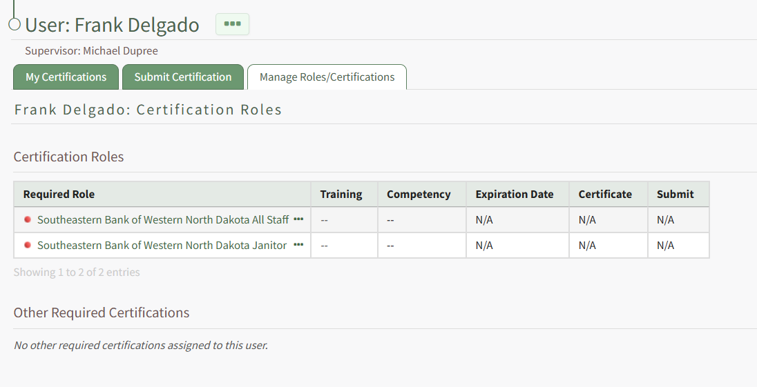 Below the Certification Roles Table on the Manage Roles/Certifications tab is a table for Other Required Certifications that are not associated with a user’s required roles.