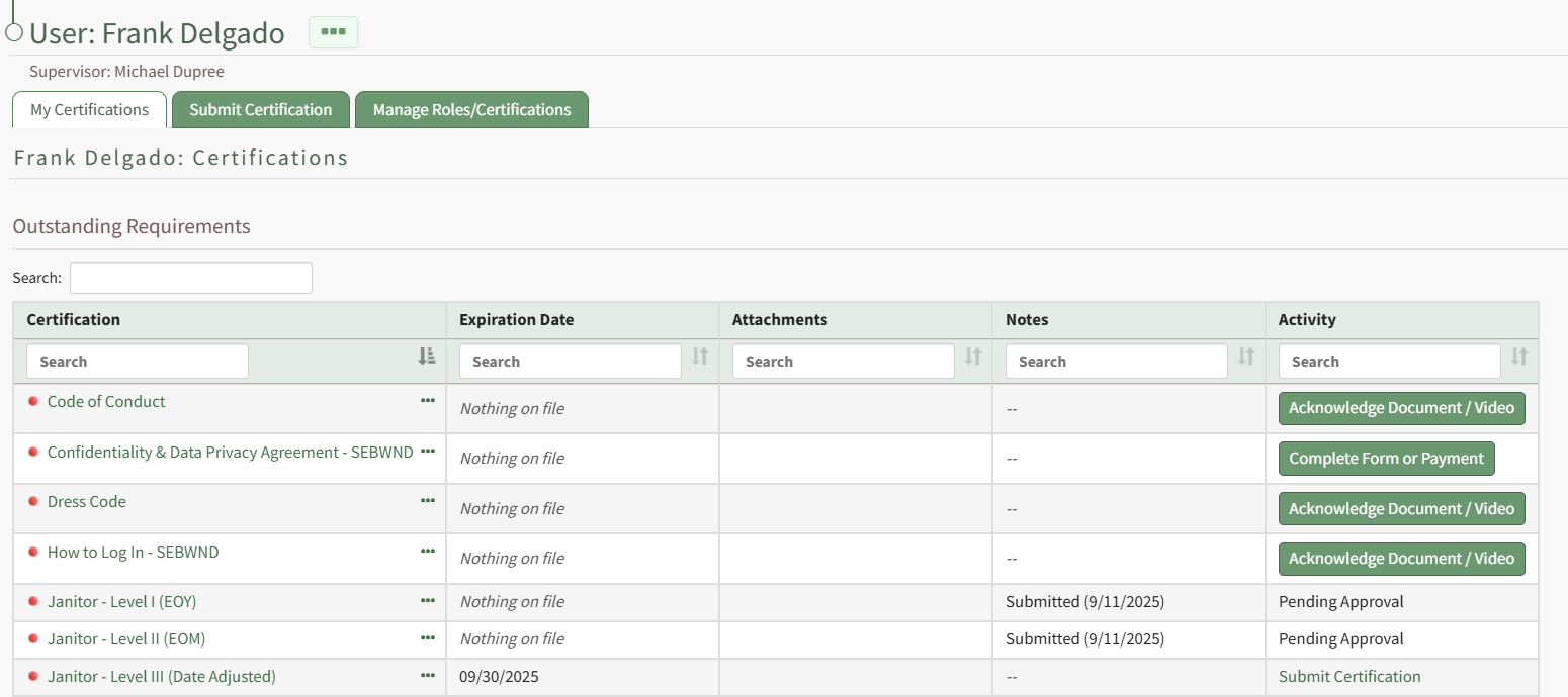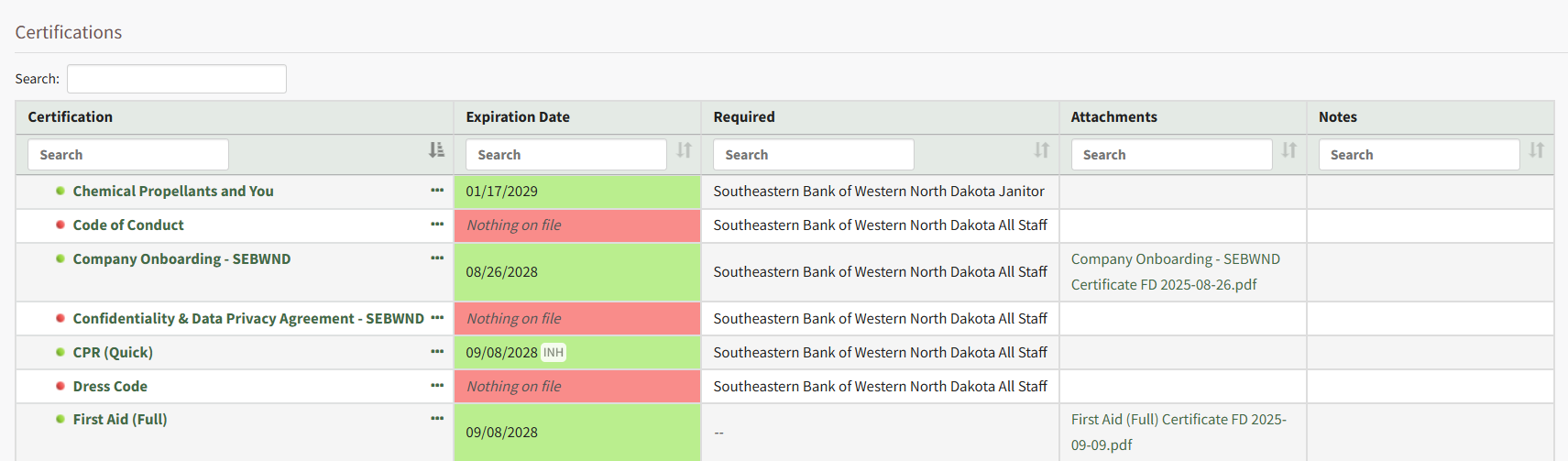 To the left of the certification name, the dot indicates the certification status. This matches the coloring of the expiration date cell. The required column states which certification role the certification is required for. The attachments column could include a PDF of the form entry, auto-generated certificates, or manual uploads.