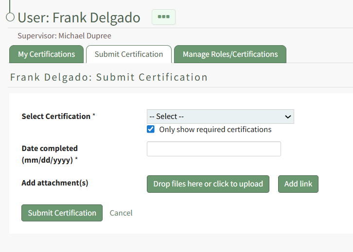 Submit Certification | Selecting Submit Certification from the context menu for the certification designated at not applicable opens the certification's Submit Certification Modal. It initiates the same action as the clickable Submit Certification link in the Activity column. How To: Submit a CertificationA user can submit a certification from the Submit Certification tab on the My Account Page in the People Module. To submit a certification, select the certification to be submitted from the dropdown list. The “Only show required certifications” checkbox can be selected for ease. Placing the cursor in the Date completed textbox opens a calendar modal allowing a user to select the certification completion date. The date can also be entered manually in MM/DD/YYYY format. Add attachments by selecting the “Drop Files Here or Click to Upload” button. Add a link by selecting the “Add Link” button. Select the “Submit Certification” button to submit or “Cancel” to return to the My Certifications tab on the My Account Page.