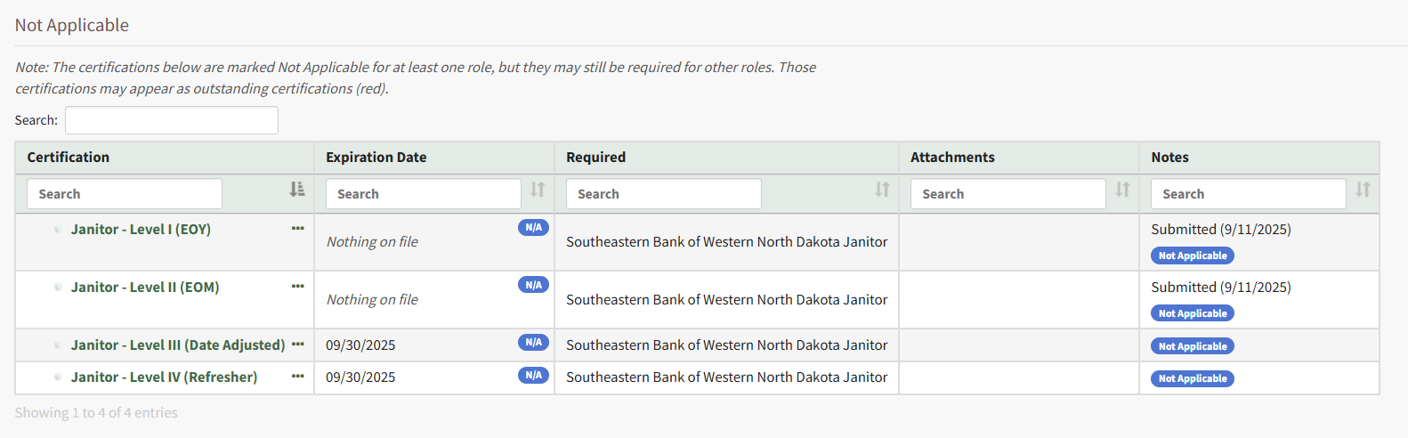The Not Applicable Section separates certifications that are assigned to you through your certification role but you are not required to complete. The table displays certifications that are required for other employees in one of your specified certification roles but an administrator designated as not applicable for this user.