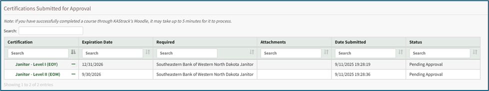 The Certifications Submitted for Approval Section contains a table that displays the certifications that have been submitted but are waiting for supervisor approval.