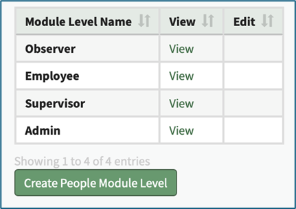 The Module Levels Tab on the Settings Page of the People Module displays the different Module Levels for the People Module. Selecting “View” opens a new page that shows the default permissions granted to each module level.