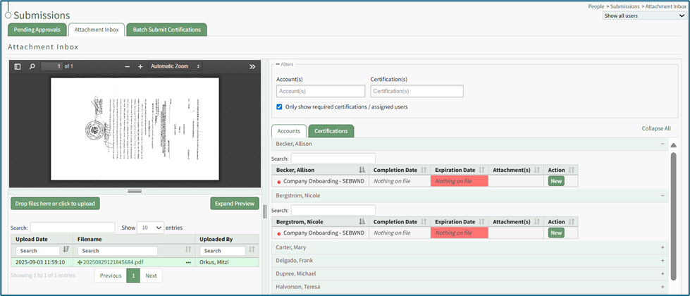 The Attachment Inbox Tab allows a supervisor to upload documents in bulk that are to be utilized for user certifications.