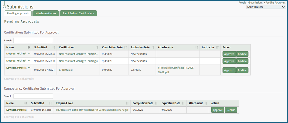The Pending Approvals Tab displays all user certifications and competency certificates that have been submitted and are awaiting approval. The Date/Time Submitted, Certification, Completion and Expiration Date, and Attachments are included in the Submitted Certifications Table. The Action column has an Approve and Decline button.