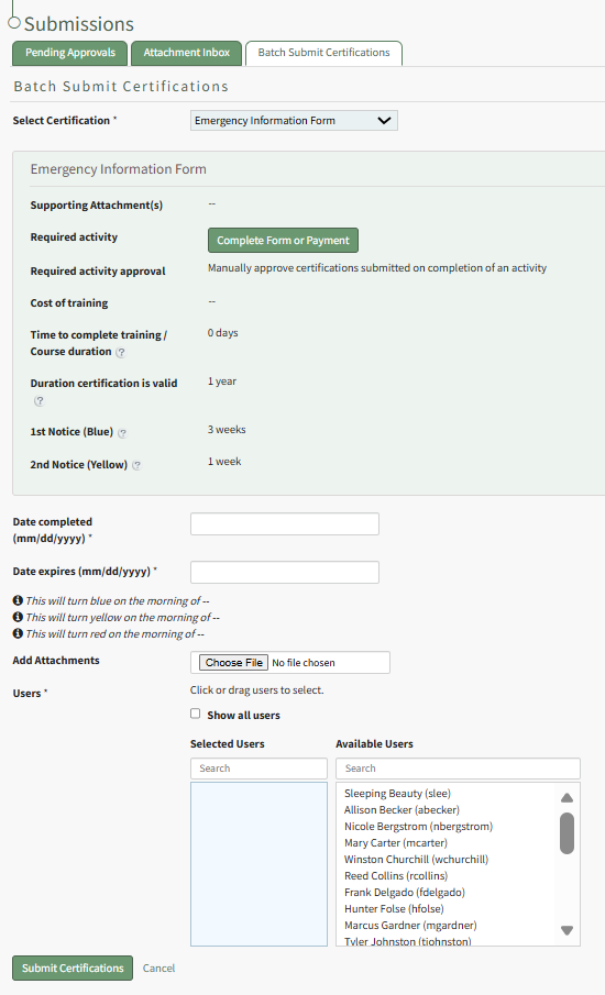 The Batch Submit Certifications tab allows a supervisor to select a certification from a dropdown menu and bulk submit it to certify a group of users simultaneously.