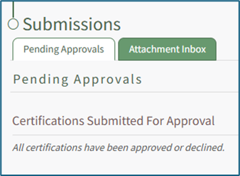 The Submissions Page is comprised of three tabs, Pending Approvals, Attachment Inbox and Batch Submit Certifications. An explanation of each tab is included below.
