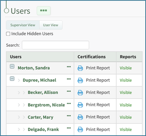 Selecting the Include Hidden Users checkbox will show any individuals designated as a hidden user in the Users Table; however, their user certification report is not visible in the Reports Column of the user table (their status is shown as hidden).