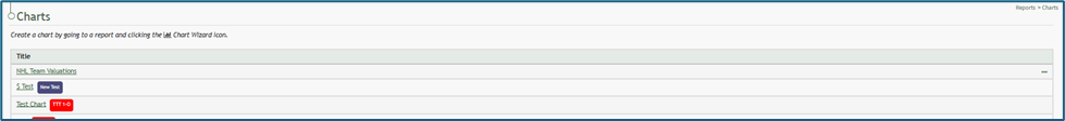 The Charts Page of the Reports Module displays a table of all charts that have been created by or shared with an individual.