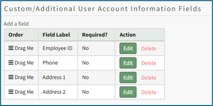 Custom account fields show in the Additional User Account Information Table. Select the clickable "Delete" link in the actions column to the right of the field you wish to delete. This opens the Field Deletion Confirmation Modal which states, "Are you sure you want to delete this field and all associated user account information?"