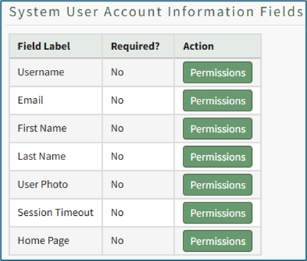 System User Account Information Fields are displayed in the first table. Select the Permissions button in the Action column opening the Edit Field Restrictions Modal.