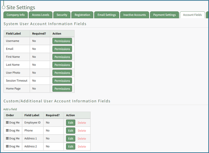 To edit the permissions associated with system user account information fields, open the Account Fields Tab in the Site Settings Module from the Main Menu.