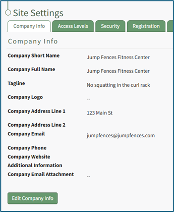 To edit company information, open the Company Info Tab from the Site Settings Page in the Site Settings Module.