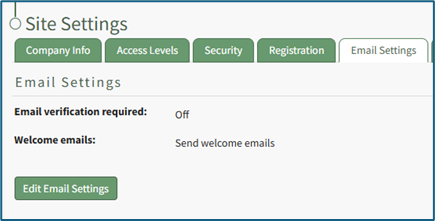 The Email Settings Tab in the Site Settings Module allows for the customization of Email Settings. These settings control what new user accounts will require email verification and if new users will receive welcome emails by default.
