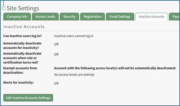 The Inactive Accounts Tab on the Site Settings page allows for customization regarding inactive users. Default system settings prevent inactive users from logging in, prevent user accounts from being automatically deactivated for inactivity, prevent user accounts from being automatically deactivated when certification / role requirements are expired/no longer valid (e.g. red certification status), do not exempt access levels from account deactivation, and has inactivity alerts disabled.