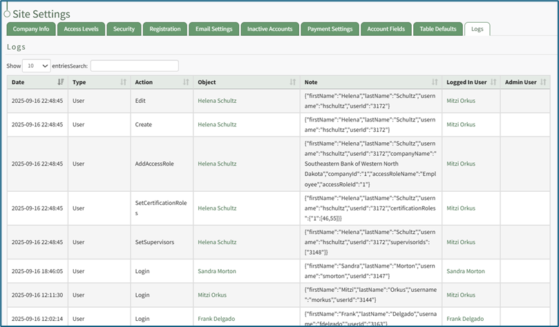 The Logs Tab on the Site Settings Page is a log of read-only records of historical actions within your installation.