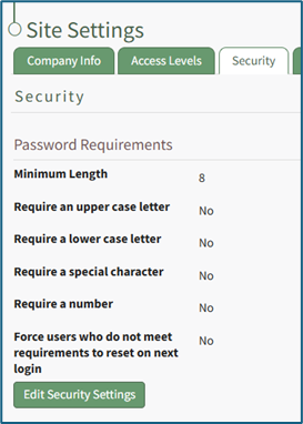 To edit password requirements, open the Security Tab in the Site Settings Module. The current settings will show before changes are made.