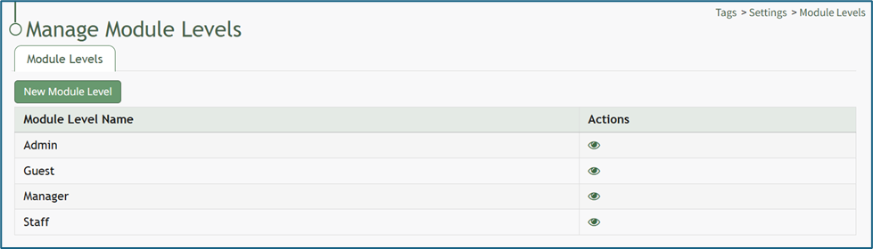 There are four default module levels associated with Tags Module. An explanation of the permissions associated with each module level are shown in the Tags Module Level Permissions Table below.